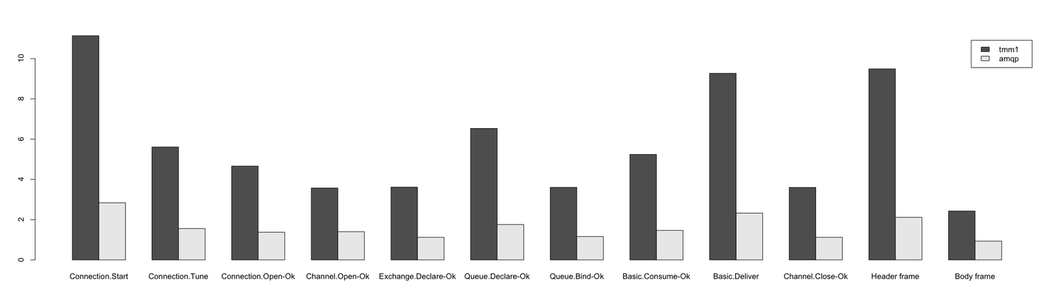I'm not going to write about technical details of these benchmarks, get the sources and take a look yourself. I run every example 50,000 times, except of the example for the AMQP preamble which I run 200,000 times.